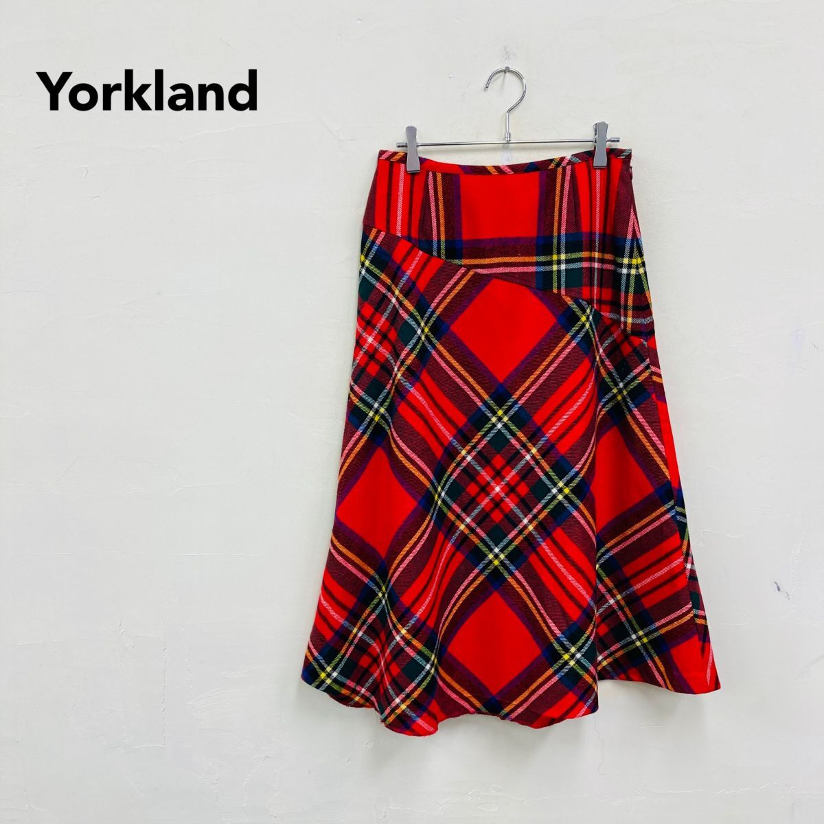 > 2O2242-J-N◆日本製 Yorkland ヨークランド チェックフレアスカート◆サイズ9AR チェック 切替 毛90% ウール混 レディース レッド
