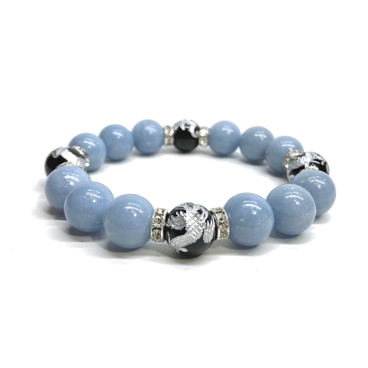 - 四神獣銀彫オニキス×エンジェライト 12mm パワーストーン ブレスレット天然石 青龍 白虎 玄武 朱雀 運気上昇 開運 金運 お守り 四神相応 S