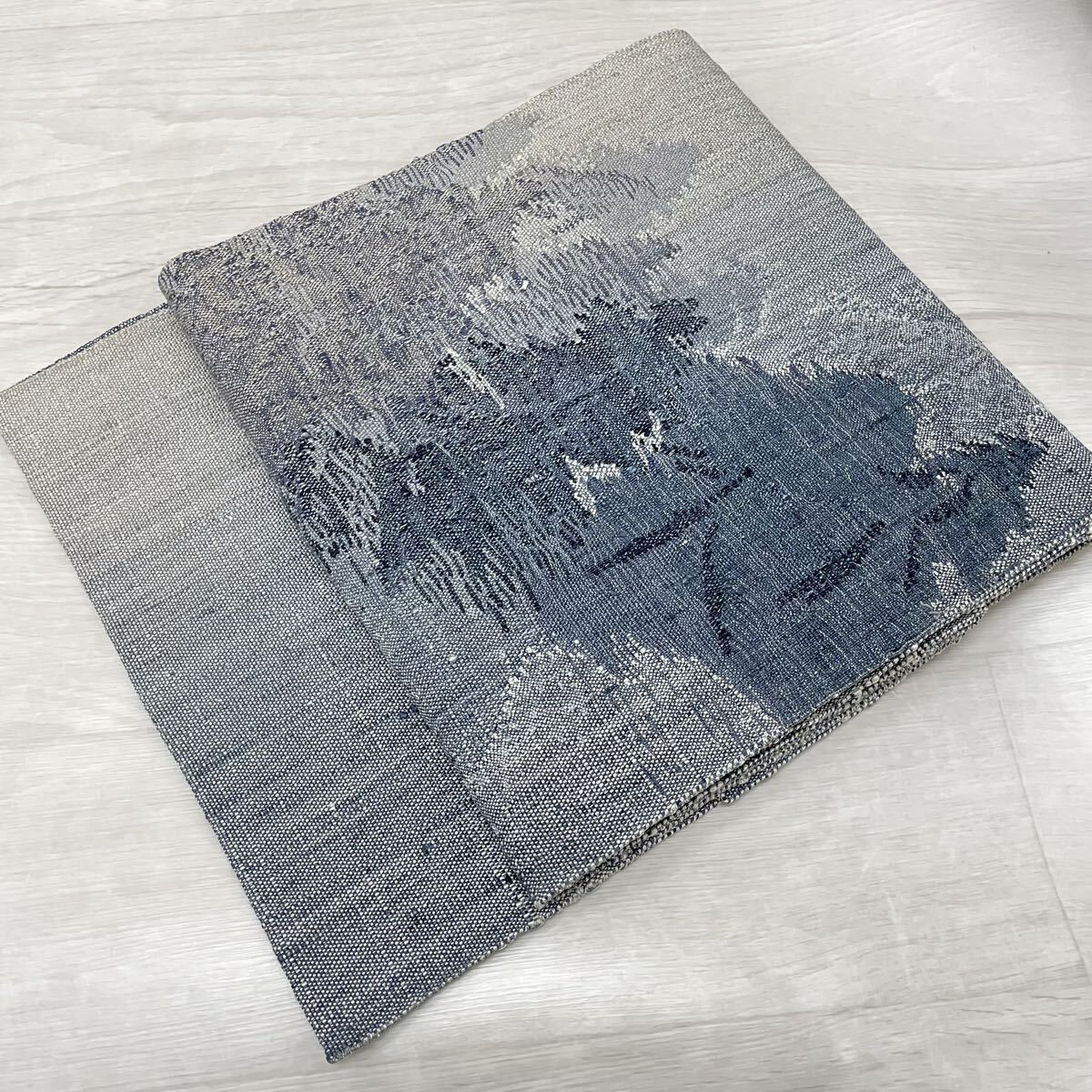 > 名古屋帯 真綿紬 上品なグレー 風景 八寸 正絹 着物 W-5189