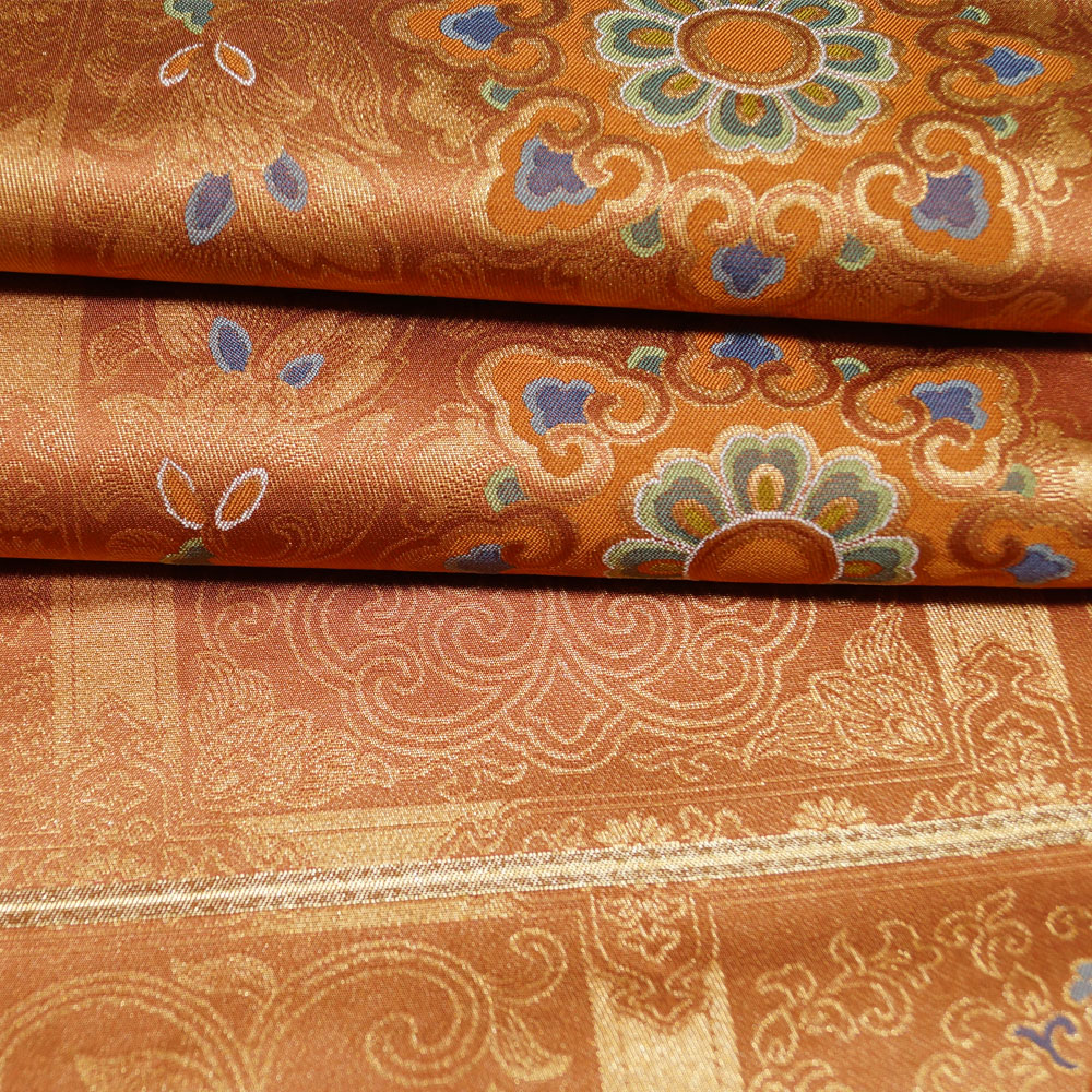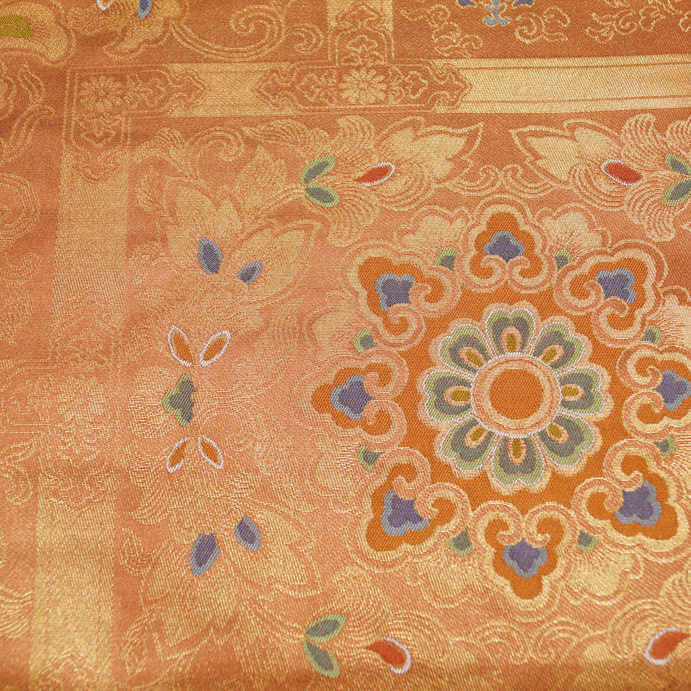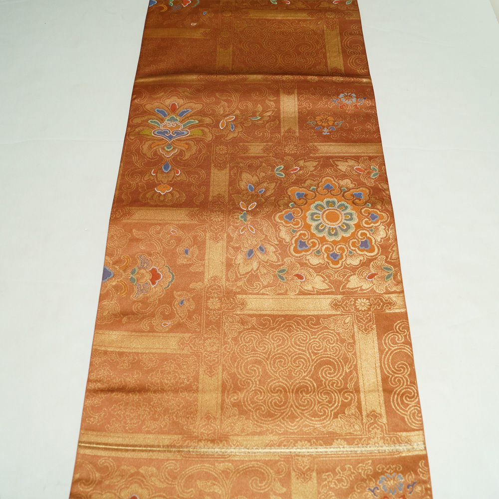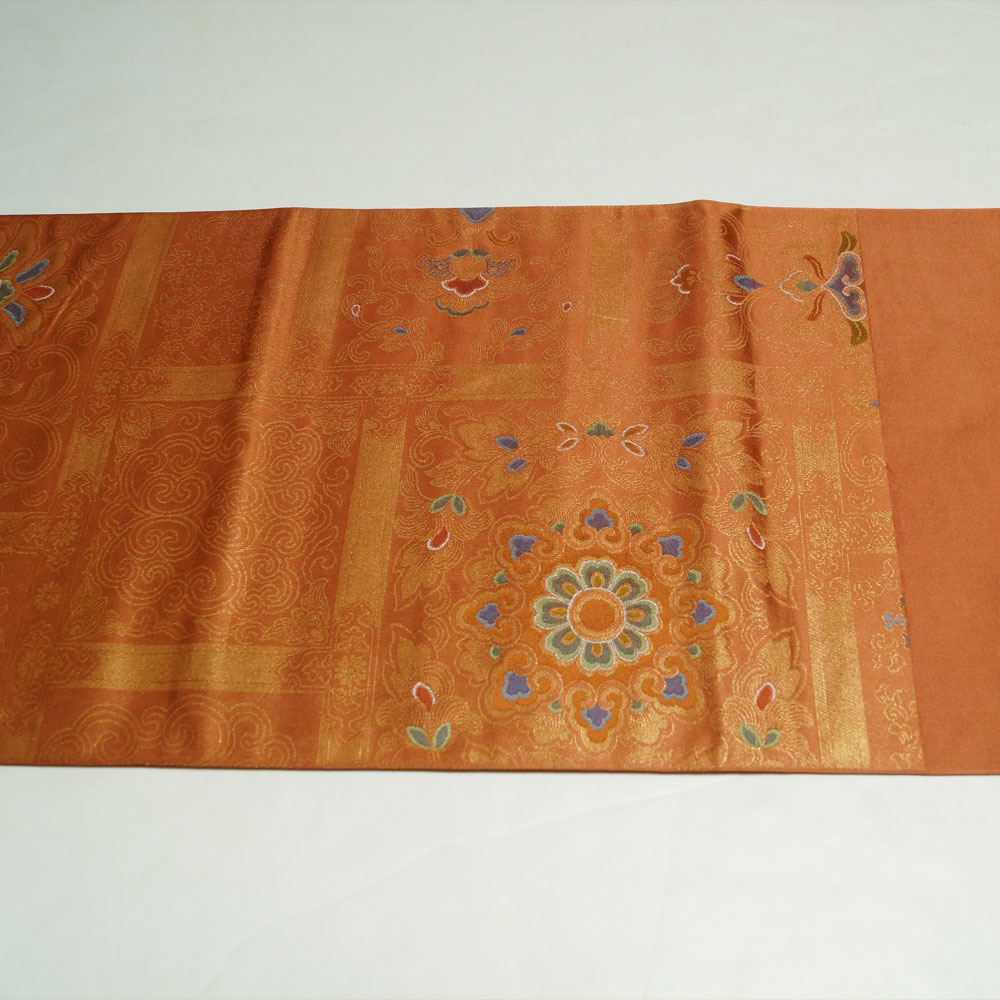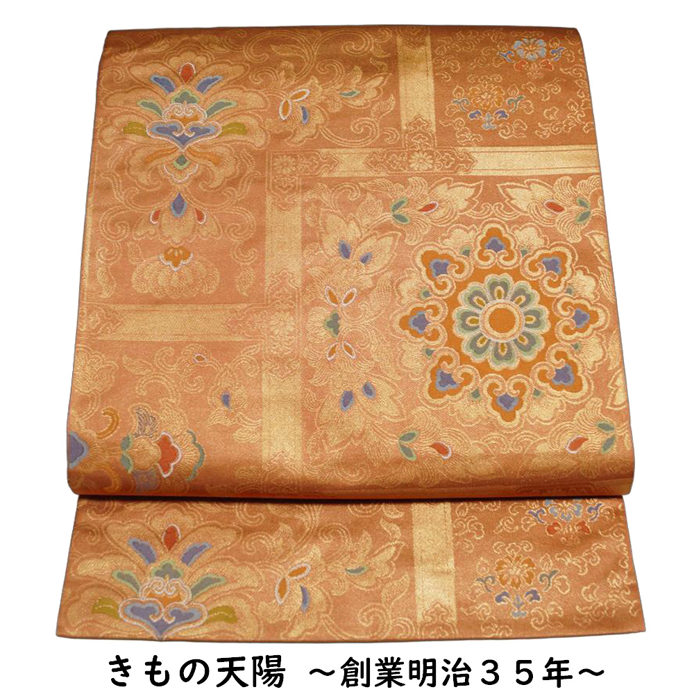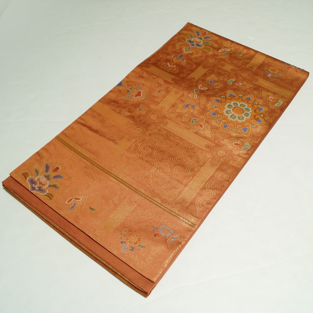 > 袋帯 天井格子に華文、唐花模様 金糸 六通柄 茶色系 中古 リサイクル着物 帯 フォーマル 着物 きもの天陽