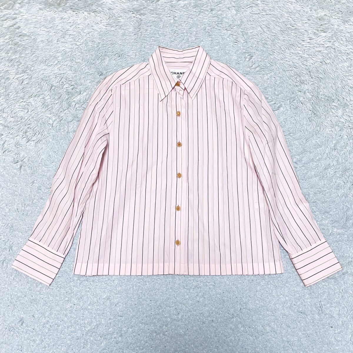 - シャネル CHANEL ココマーク ボタン ショート丈 シャツ ブラウス ストライプ チビ丈 CCロゴ COCO mark ピンク系
