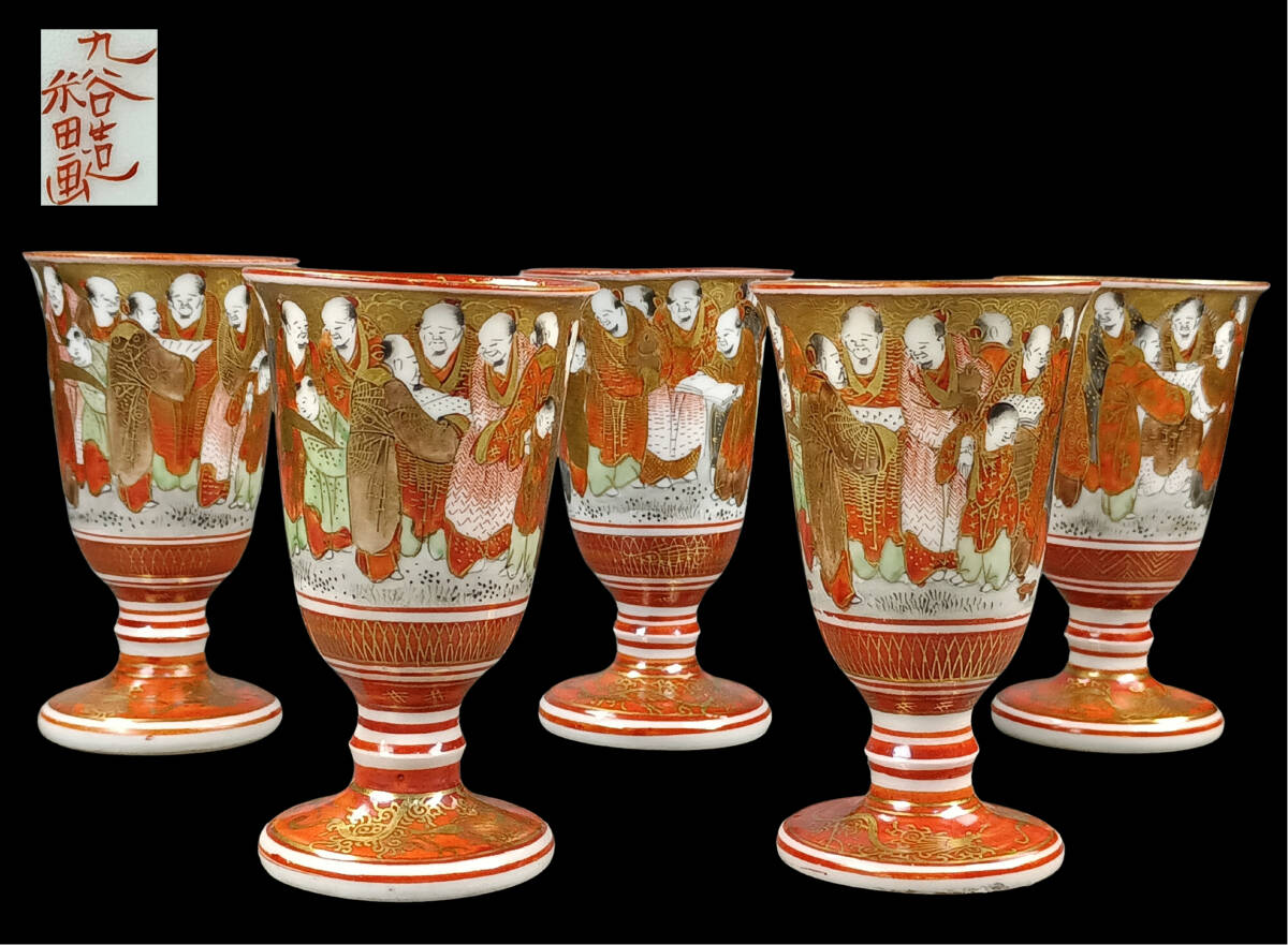 - 【偲】九谷造 禾田画 友山造 馬上杯 赤絵盃 酒盃 赤絵 金彩 5客 高さ約8㌢ 九谷焼 人物文 盃 在銘 b-55