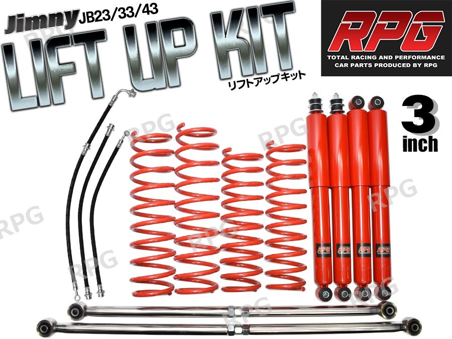 - ジムニー JB23/JB33/JB43 3インチ リフトアップキット RPGロングショック赤 ステンラテ コイル赤 50mmロングブレーキホース付