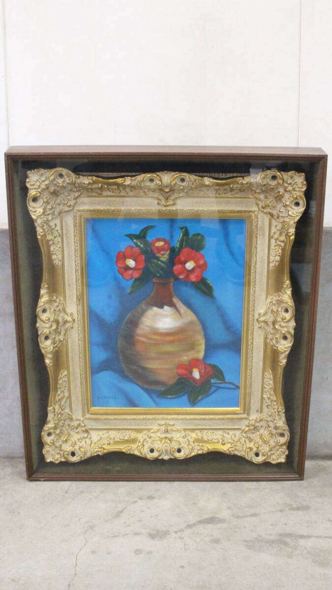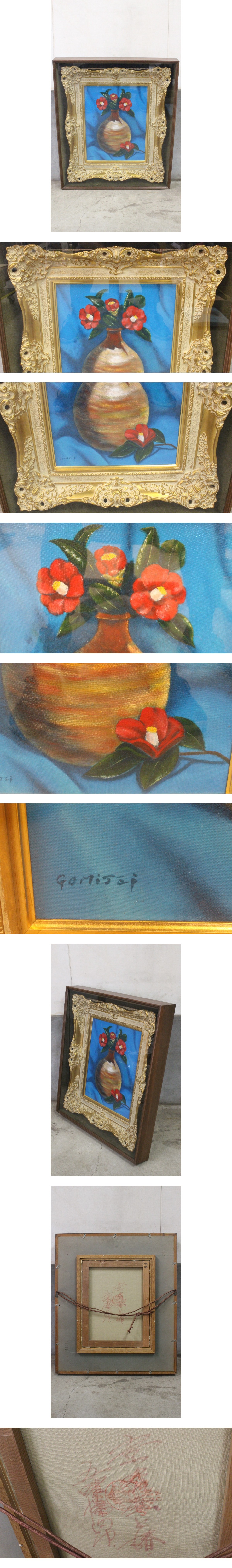 - 【真作】五味悌四郎 油彩 F6号「椿」 静物画 ガラス木枠額装 イ68