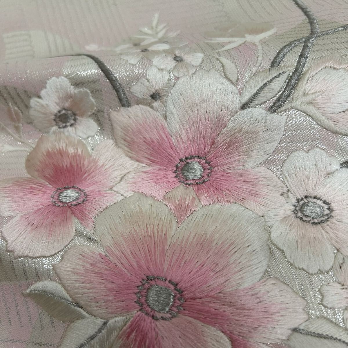 - 刺繍 名古屋帯 正絹 美しい花 九寸 Q-220