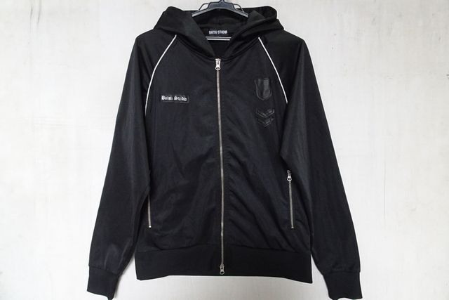 > BA-TSU STUDIO/長袖パーカ/ジャージ素材/前ジップ/シルバーパイピングライン/レザー調プリント/ドクロ/黒/ブラック/LLサイズ(10/22R7)
