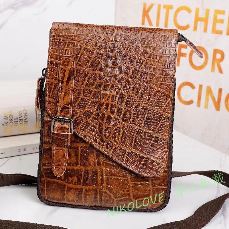 - ☆新品SALE 本革 牛革メンズ レザーバッグ クロコダイル型押し 斜めがけ ショルダーバッグ 男性 ブラウン
