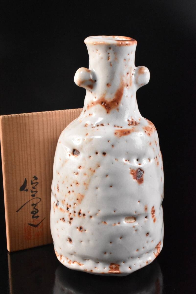 - 【雲】某収集家買取品 志野 白釉 花入 在銘 共箱 古美術品(花器花入) F8574