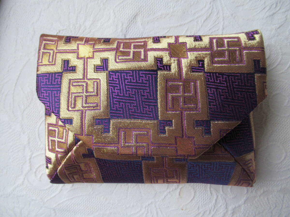 - 手作り 数寄屋袋 金襴 21x14cm 和風のポーチとしても!紫地に金