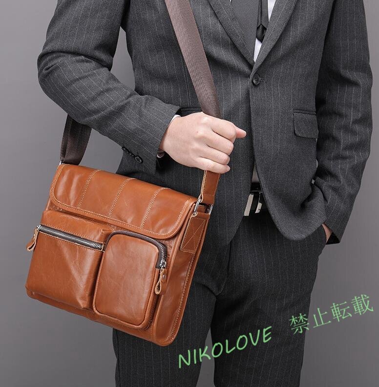 - ☆新品本革 牛革メンズ レザー ショルダーバッグ 斜めがけ 高級 ビジネスバッグ 書類 鞄 カバン 大容量 通勤 ブラウン
