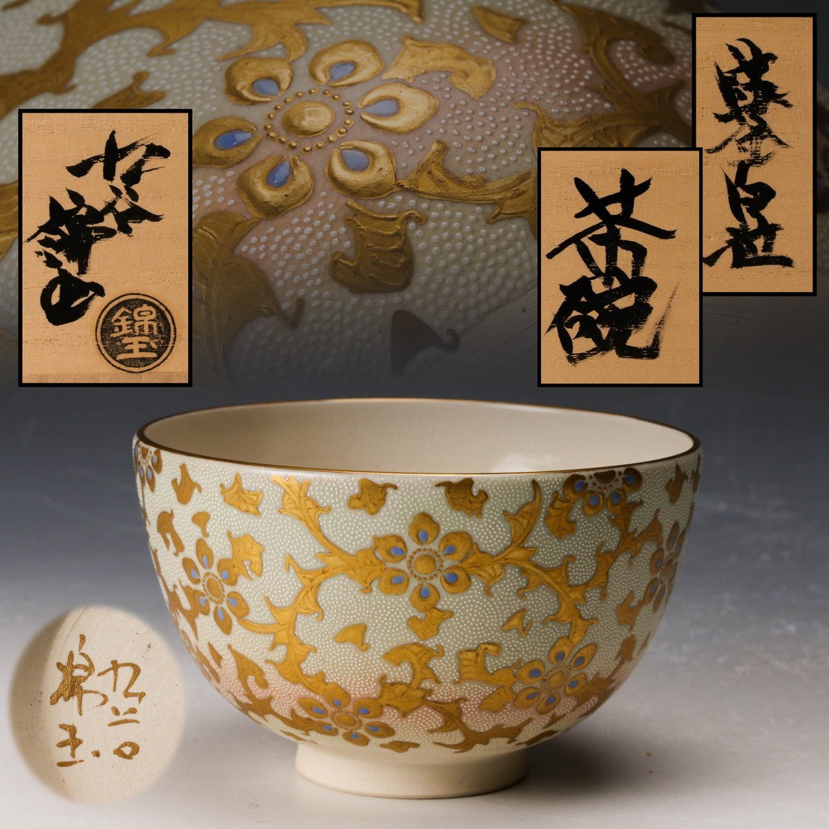 【佳香】中田錦玉 盛金白粒茶碗 共箱 共布 栞 茶道具 本物保証拍卖