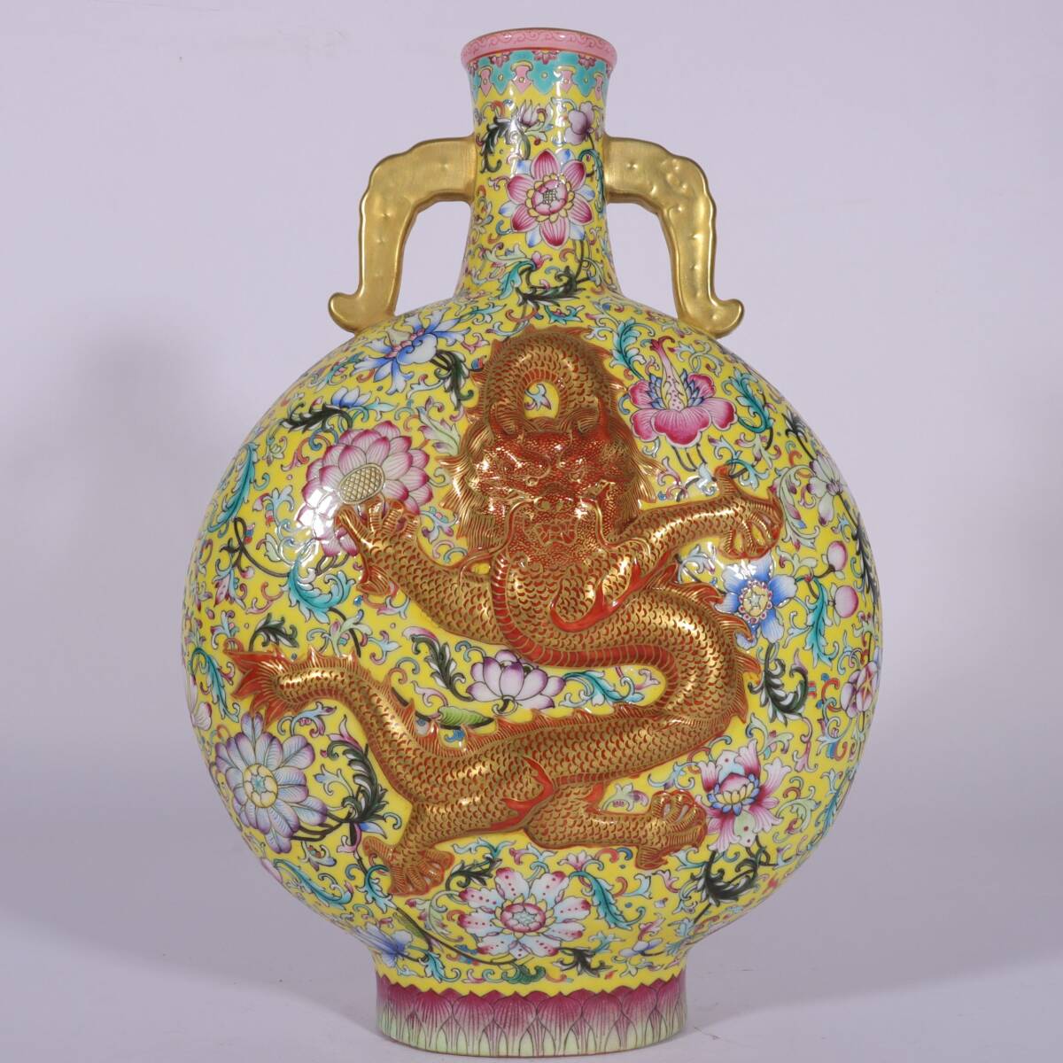 - 古美術 大清乾隆年製款 琺瑯彩 描金 黄地 古陶磁 高浮雕 纏枝蓮花 龍鳳抱月瓶 細密細工造 擺件 骨董品 古賞物 時代物 A08