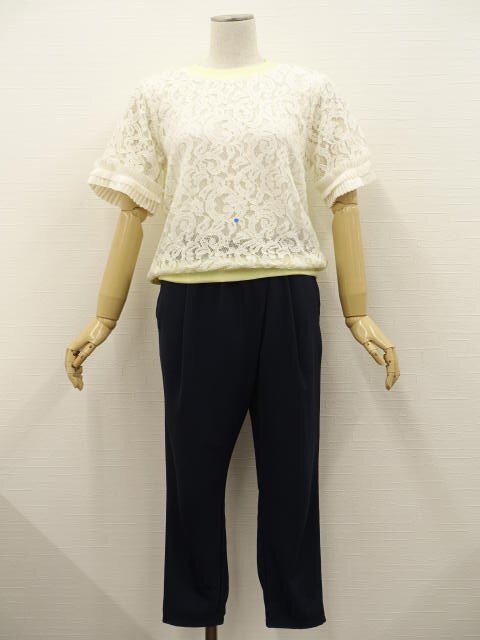 > 美品 Clu&PLST 五分袖異素材カットソー+テーパードパンツ コーディネート2点セット SS相当 白 草木柄&黄/紺 フェミニン系 20代・30代