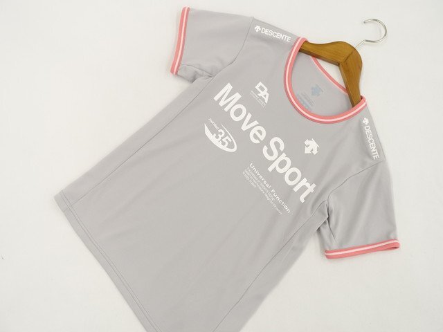 > 美品 デサント DESCENTE 半袖 ラウンドネック Tシャツ スポーツ M グレー地 ホワイト 英字プリント 【メール便可】