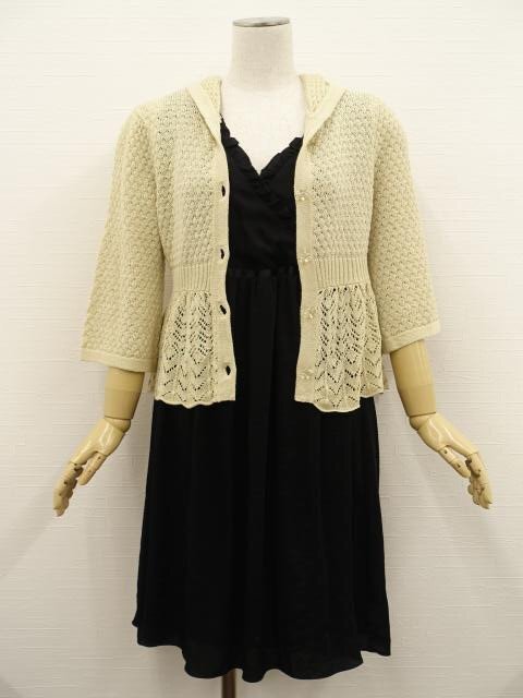 > 美品 JAYRO等 七分袖カーディガン+ロング丈ノースリーブワンピ コーディネート2点セット M相当 ベージュ/黒 フェミニン・ガーリー系 20代~