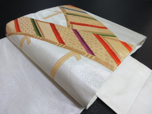 - 1円 中古 名古屋帯 正絹 和装 和服 アンティーク 流水 渡橋 太鼓柄 九寸帯 長さ353cm【夢職】★