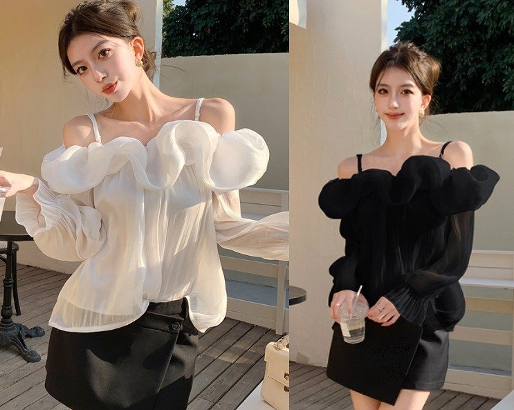 > トップス キャミソール 長袖 シャツ ブラウス オフショルダー フリル かわいい セクシー かわいい レディース L ホワイト