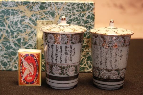- 【新品未使用】★美品 贈答品『九谷焼 金彩菊花文夫婦湯呑 1組』★検:(初だし/陶磁器/昭和/レトロ/めおと/当時物)60530E