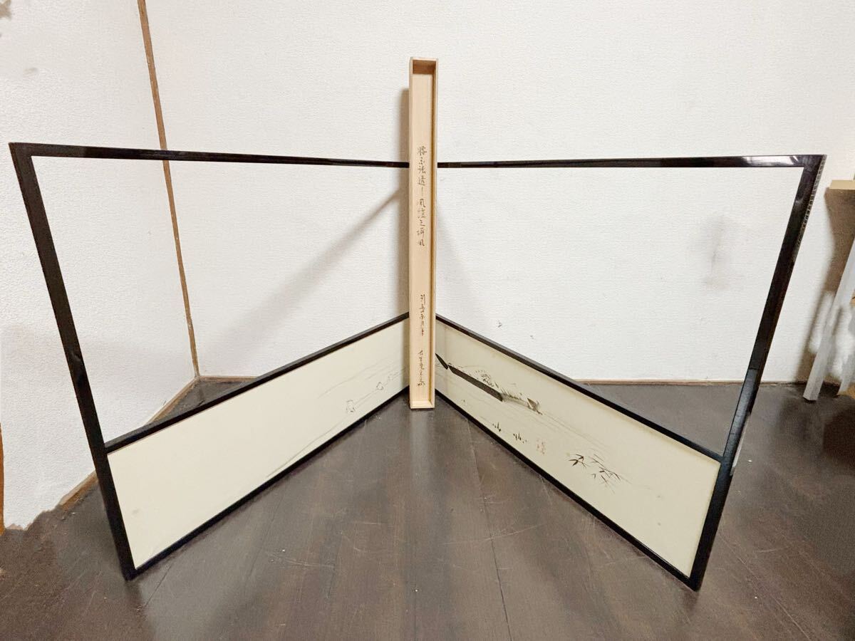 > M704950 茶道具 堀内宗完 (兼中斎・宗心)宗匠 自筆 曳舟図 如心斎好 腰風風炉先屏風 上透かし 黒 書付 花押 炉風炉兼用 共箱