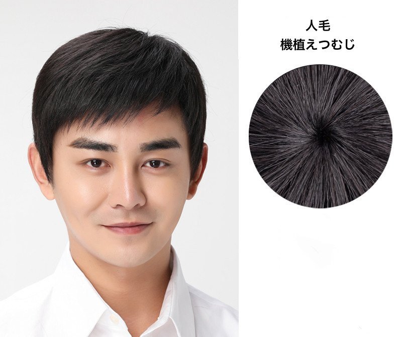 - フルウィッグ メンズウィッグ かつら 男性用 ショート 脱毛症対策 人毛 カツラ つむじ 自然黒 普段使い 短髪 機植えつむじ L(57-62cm)