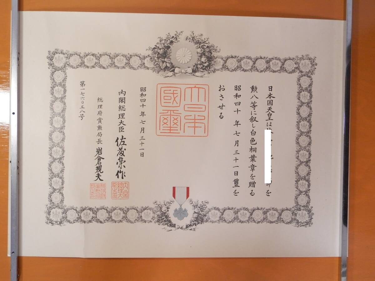 - 勲記 勲8等白色桐葉章 昭和40年 1965年 佐藤栄作総理大臣時代
