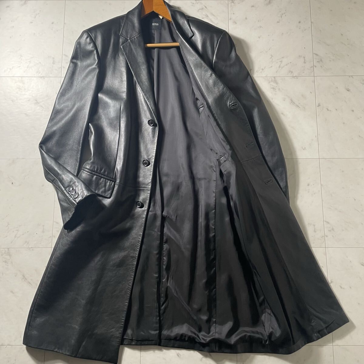 - 超弩級XXXXL!!!イタリア製ラムレザー!!!【ヒューゴボス HUGO BOSS】着丈120cm!!! チェスターコート 本革 羊革 マキシ丈 ロング 58