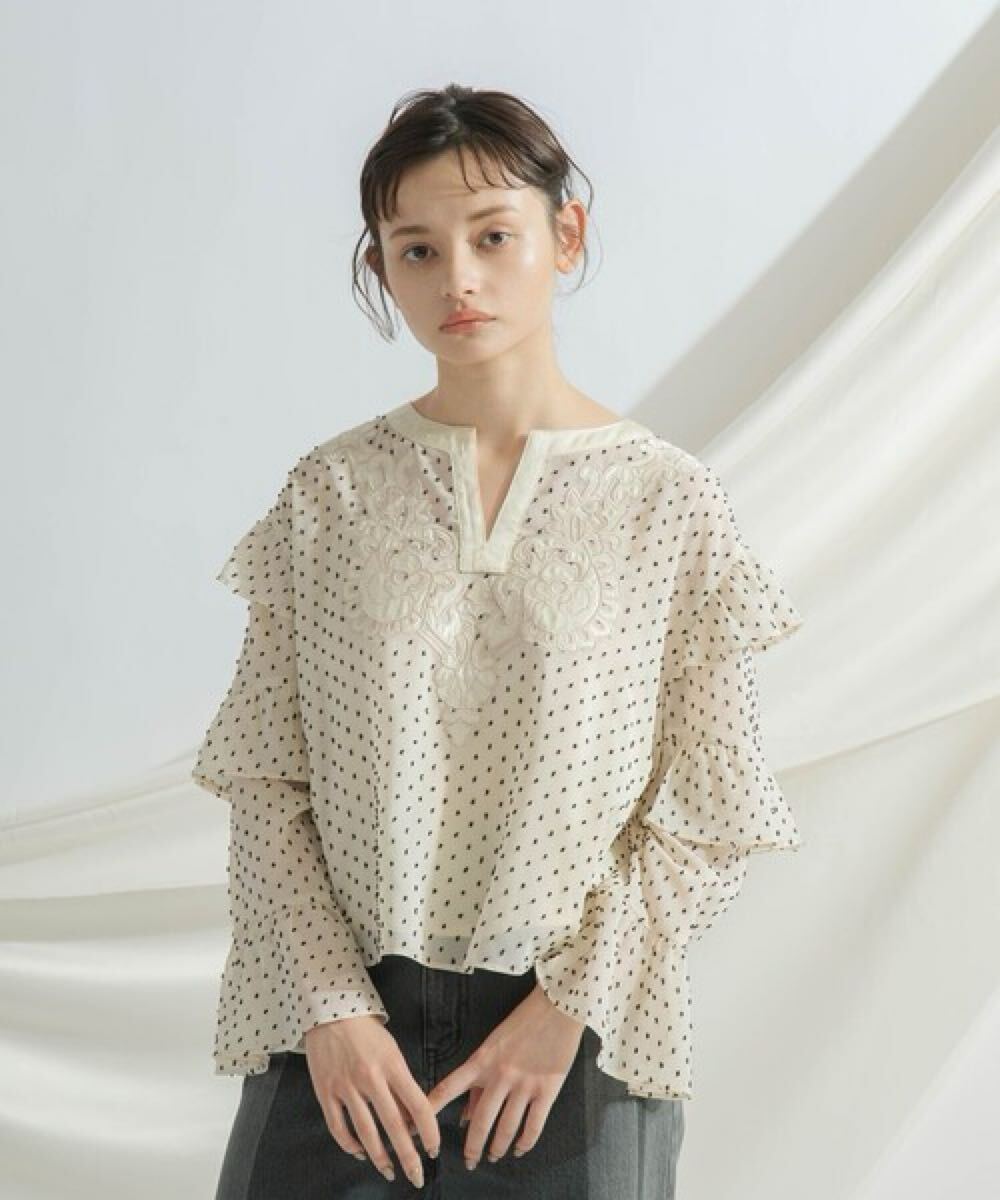 グレースコンチネンタル フリルフレアトップ 2万6400円 新品のお品 スタイリスト私物 シフォンジャガード生地と、アップリケ生地の上に刺繍を入れたフェミニンブラウスです フリルディティールやフレア袖などの甘さのあるディティールで大人に似合う上品なお品です キナリホワイト×ブラックのドット