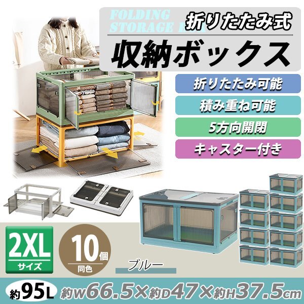 > 送料無料 収納ボックス 折りたたみ 10個セット 約66.5×47×37.5cm 2XLサイズ 95L ブルー キャスター付き 5面開閉 観音開き 積み重ね