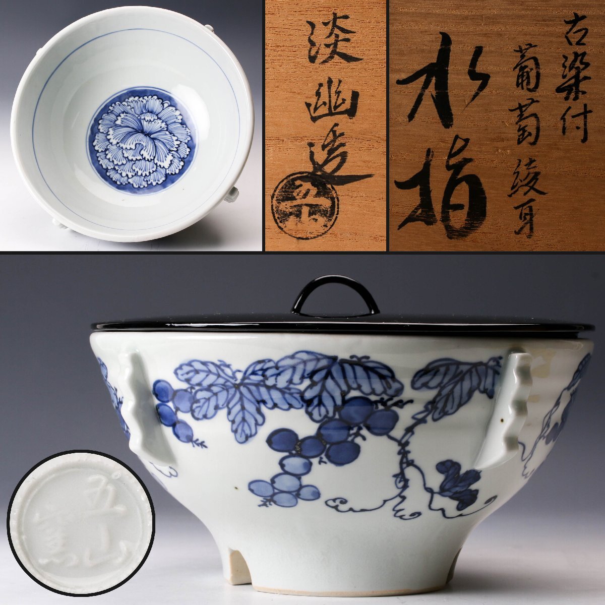 【佳香】林淡幽 五山窯 古染付葡萄綾耳水指 共箱 共布 塗蓋 茶道具 本物保証拍卖
