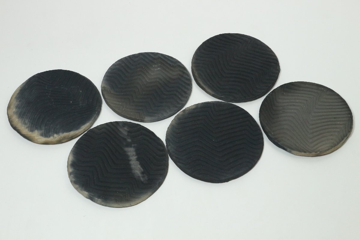 ・坂田甚内 黒陶彫文 丸皿 六客 /益子焼 中皿 銘々皿 菓子器 菓子皿