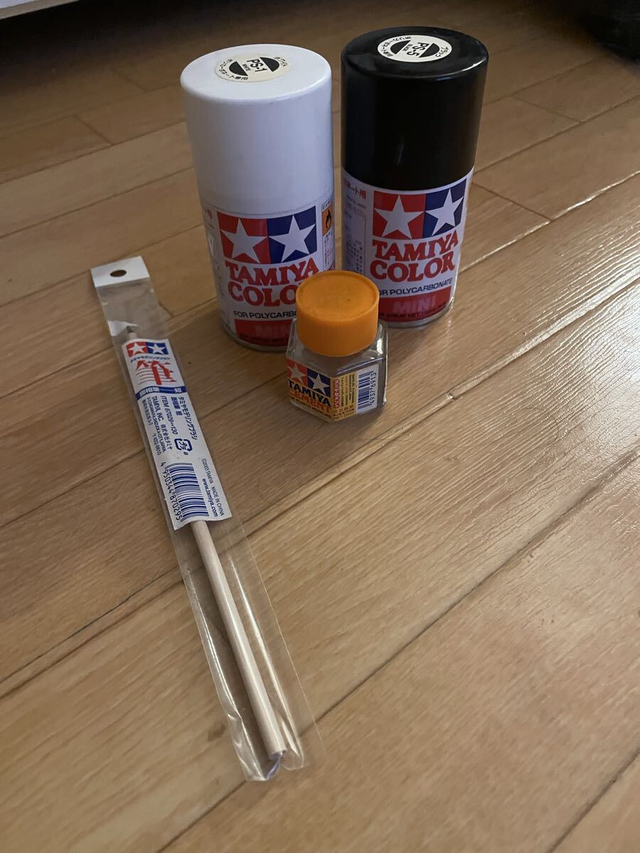 - タミヤ 白、黒カラースプレー&接着剤と未開封の細筆セット(カラースプレーと接着剤はちょいとしか使ってなくて8、9割方液ものはあります)