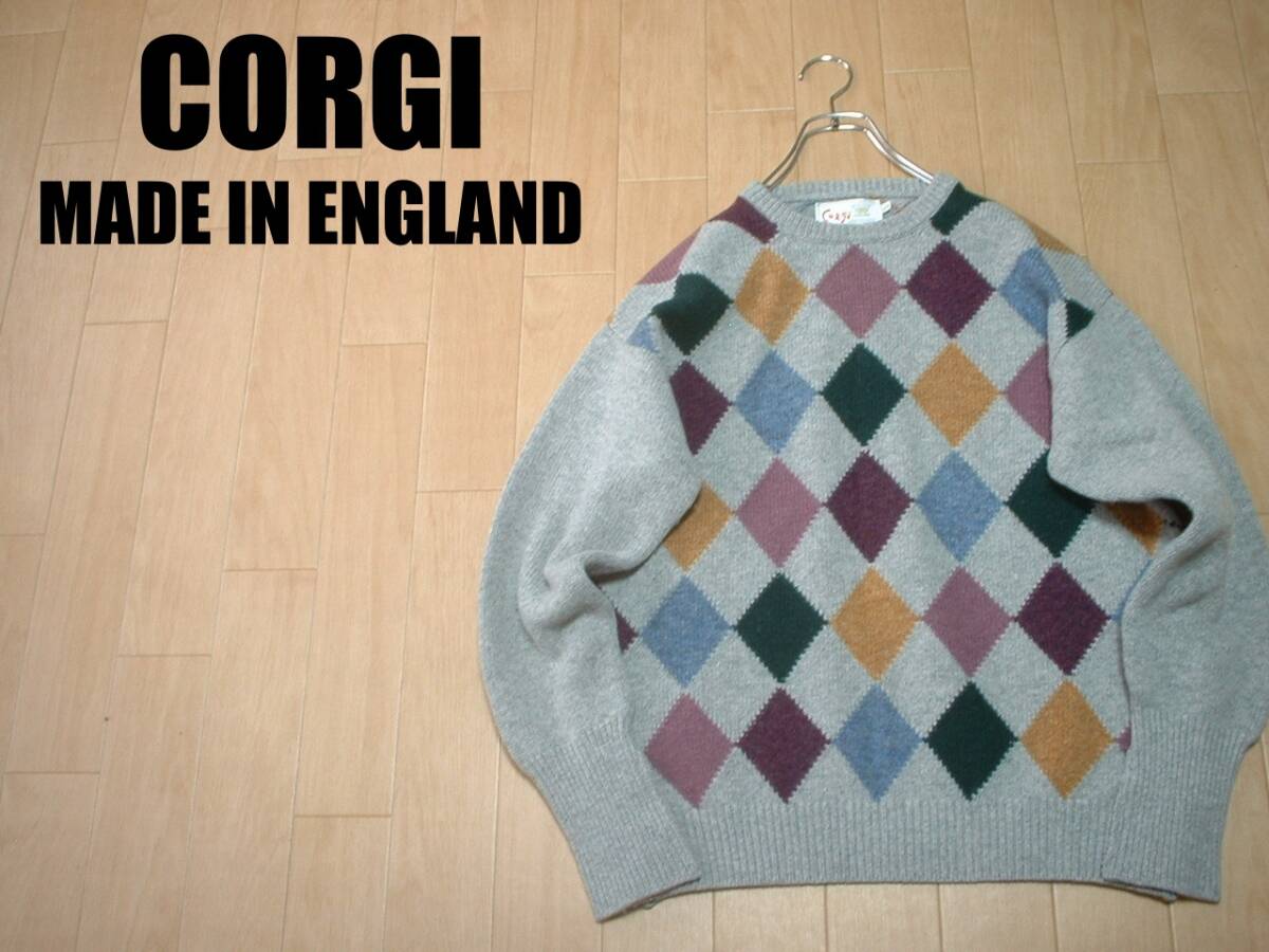 - イギリス製CORGIアーガイル柄ウールセーター44in(JPN-XL)正規WAKO GINZA TOKYO杢グレーMADE IN ENGALNDクルーネックUKイングランドニット