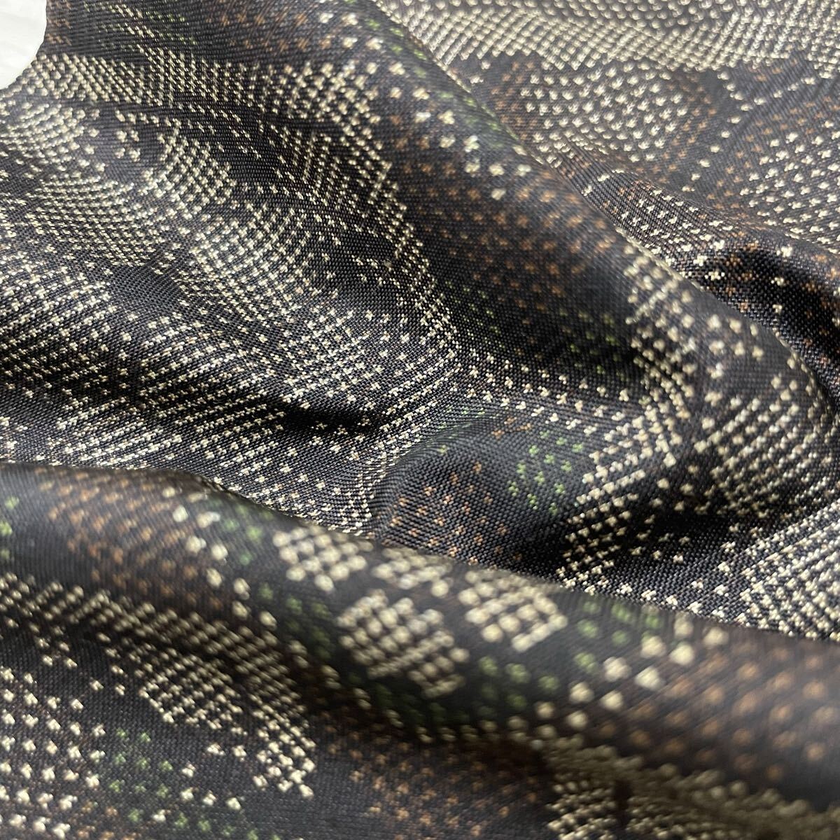 - 本場大島紬 茶泥 裄67 松皮菱に亀甲 細かな絣 着物 正絹 W-5620