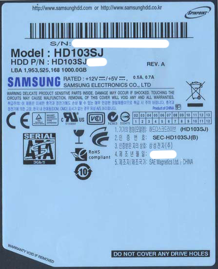 > 【中古】Samsung製HDD HD103SJ 1.0TB SATA300 7200rpm 1000~2000時間以内 [管理:1050026271]