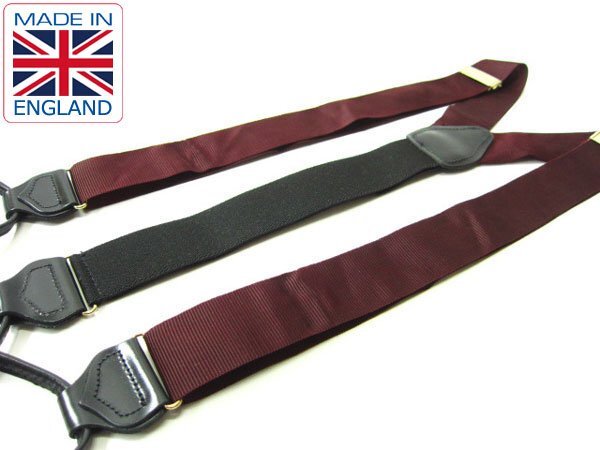- 英国製/無地×レザー/ボタンタブ式/Y型 サスペンダー/エンジ系/メンズ/Yバック/長いサイズ/ブレイシーズ/ビジネス/バンカー/投資家/D82