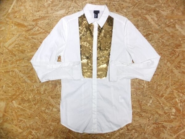 - パーティーに◎ H&M エイチアンドエム メンズ コットン混 ドレッシー スパンコール イカ胸 ブサム 長袖シャツ 白 サイズXS