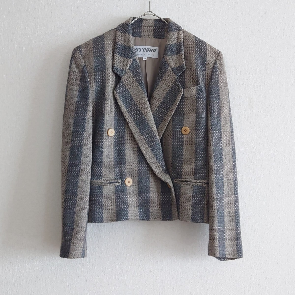 > erreuno エレウノ イタリア製 ウール テーラードジャケット ブルー グレー ストライプ チェック ダブルボタン 昭和レトロ ヴィンテージ L
