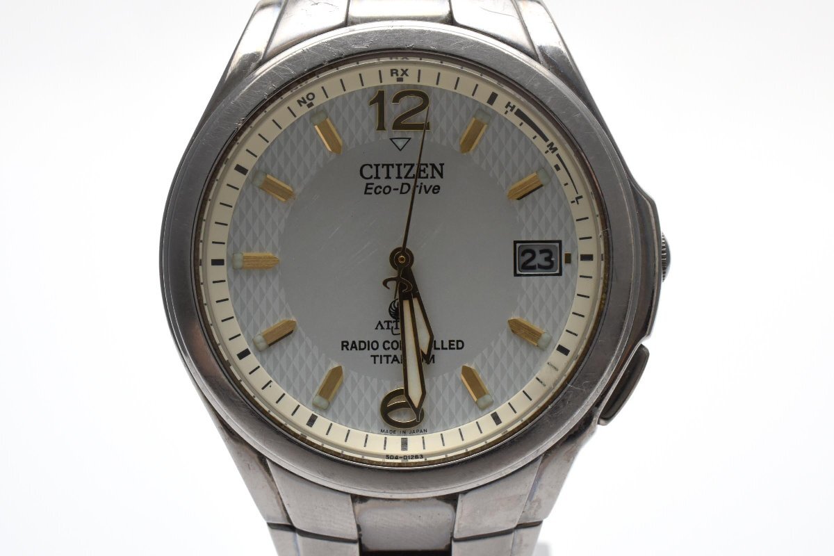 - CITIZEN Eco Drive ATTESA シチズン エコ アテッサ クォーツ 腕時計 メンズ 3針 デイト ホワイト ゴールド シルバー H410-T003788