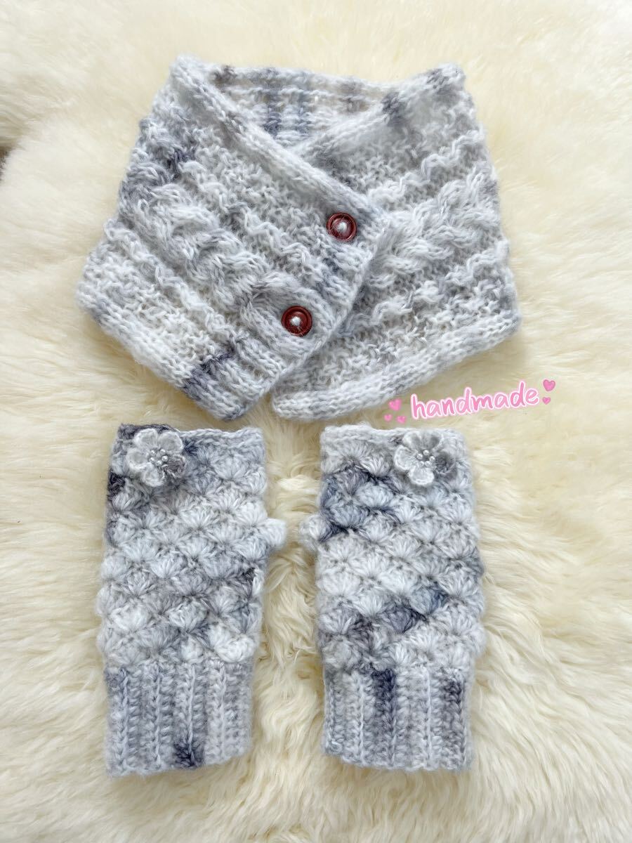 - **ハンドメイド** 手編みミニマフラー かぎ針編み指なし手袋 段染め毛糸 ふわふわ 2点セット 102802