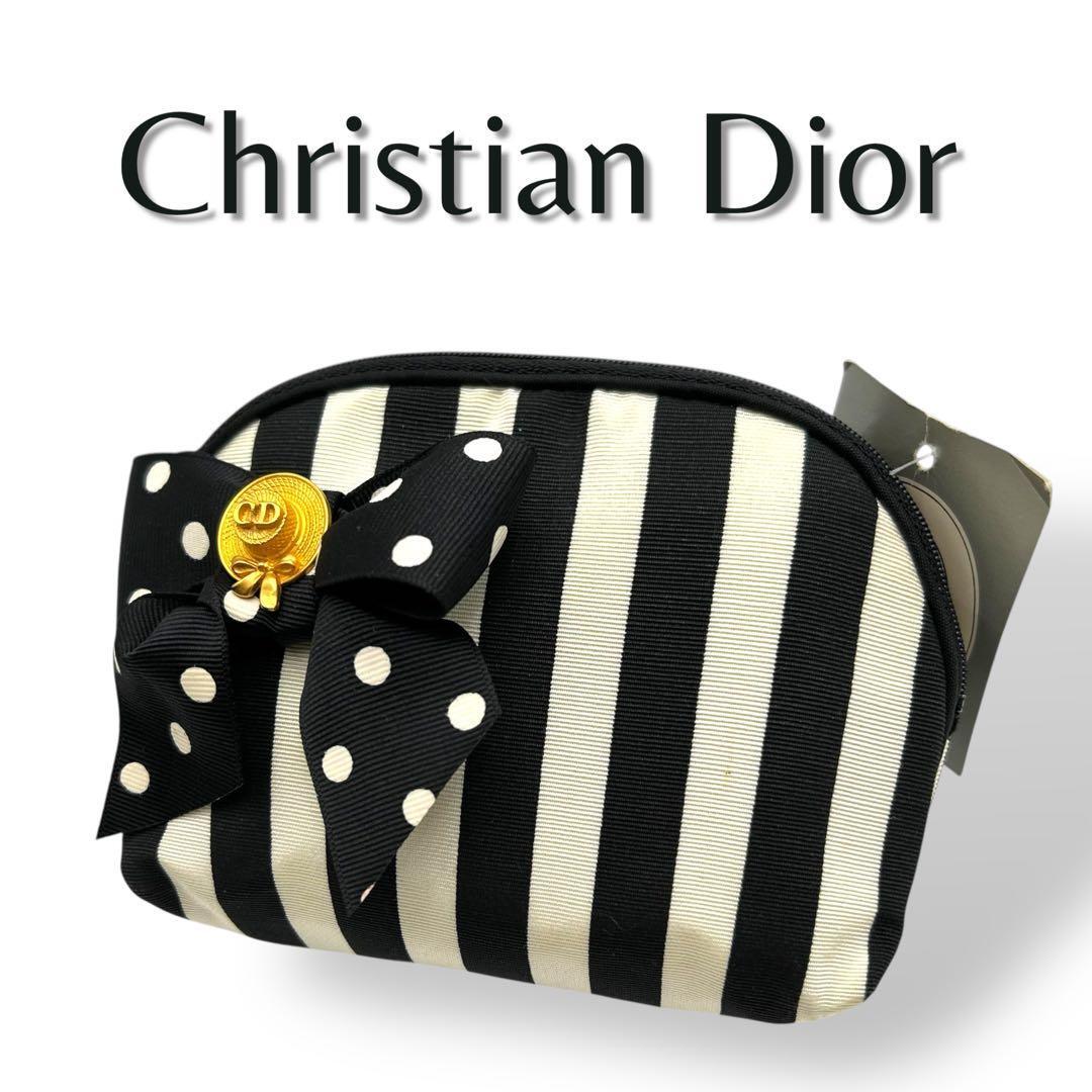 - 【極美品】Christian Dior クリスチャンディオール ポーチ ストライプ リボン 希少 タグ付き 大人気モデル 白黒