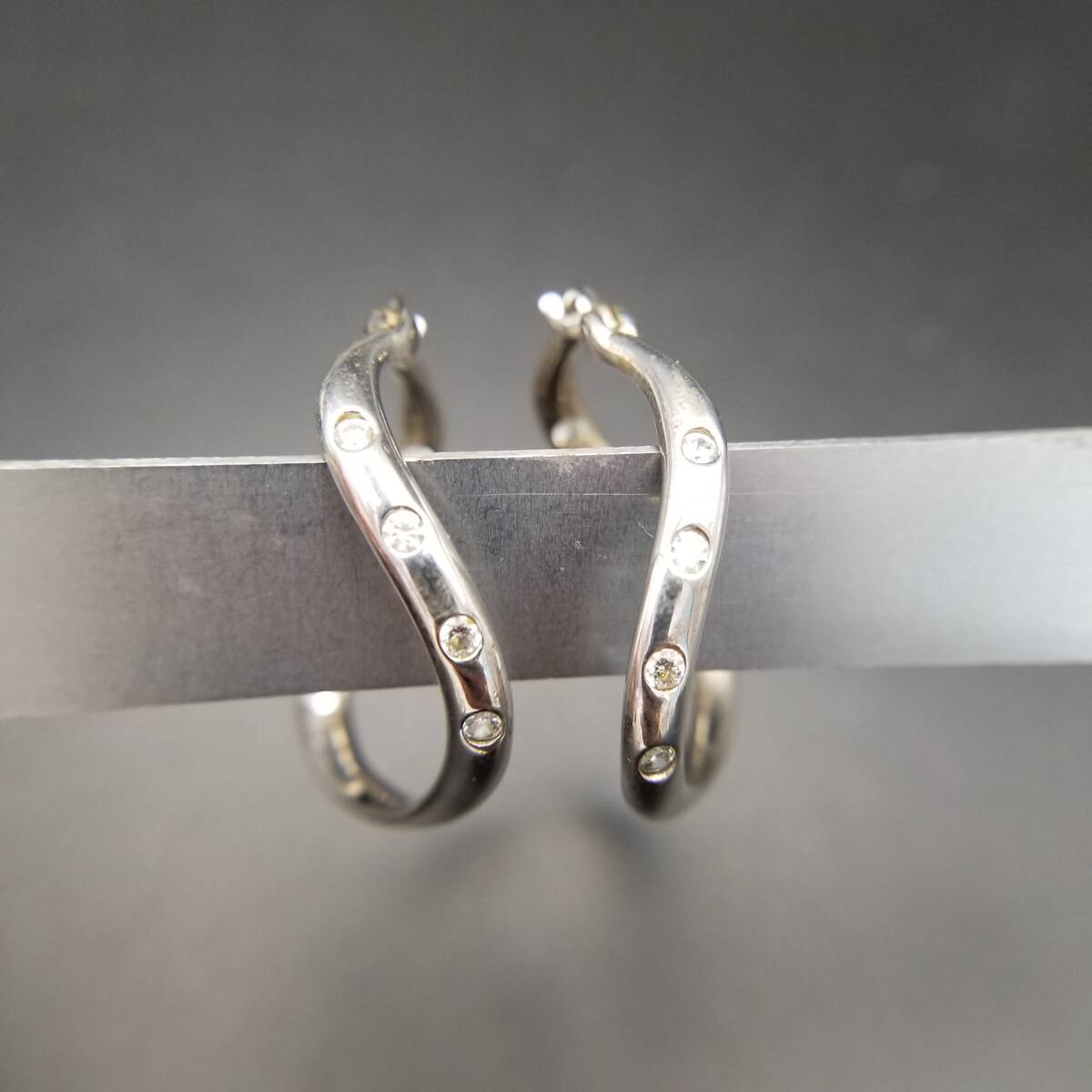 - キュービックジルコニア インレイ 煌めき 925 シルバー ヴィンテージ フープ ピアス ウェーブ 銀 存在感 モダンジュエリー Y25-F