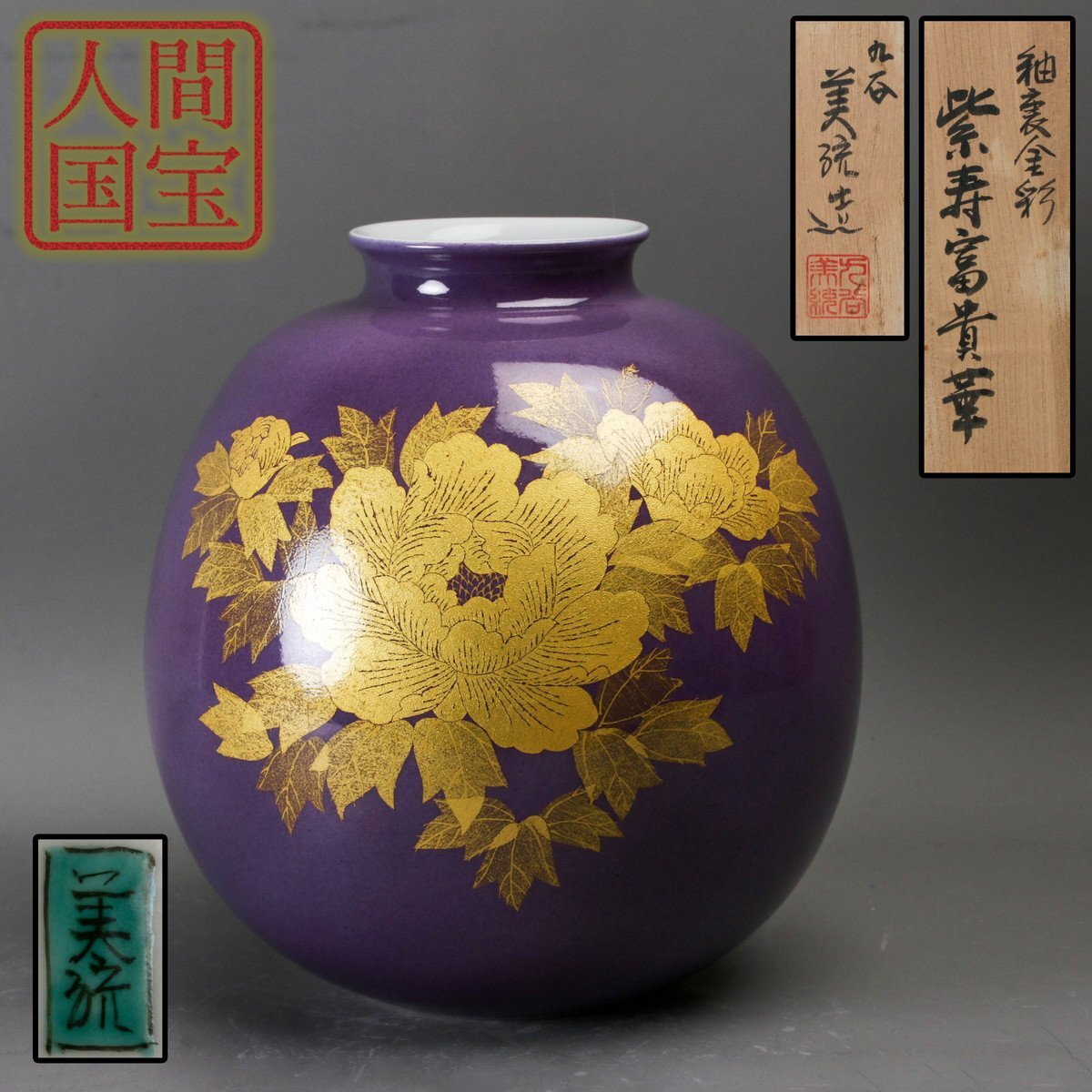 【SAG】人間国宝 三代 吉田美統 釉裏金彩 紫寿富貴華 花器 共箱 共布 栞 本物保証