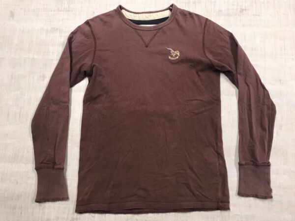 - RUSSELL ATHLETIC ラッセルアスレティック アメカジ スポーツ 前Vガゼット ロンT 長袖Tシャツ カットソー メンズ ダメージ加工 L エンジ