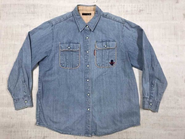- D・O・G SHOP 平成レトロ アメカジ ドッグ 犬 イヌ アニマル ロゴ刺繍 スナップボタン 長袖デニムシャツ メンズ コットン100% 3L 水色