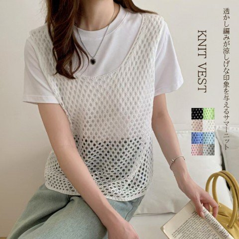 - 透かし編み ニット ノースリーブ カギ編み 透け感 抜け感 ショート丈 サマーニット フリー ブルー