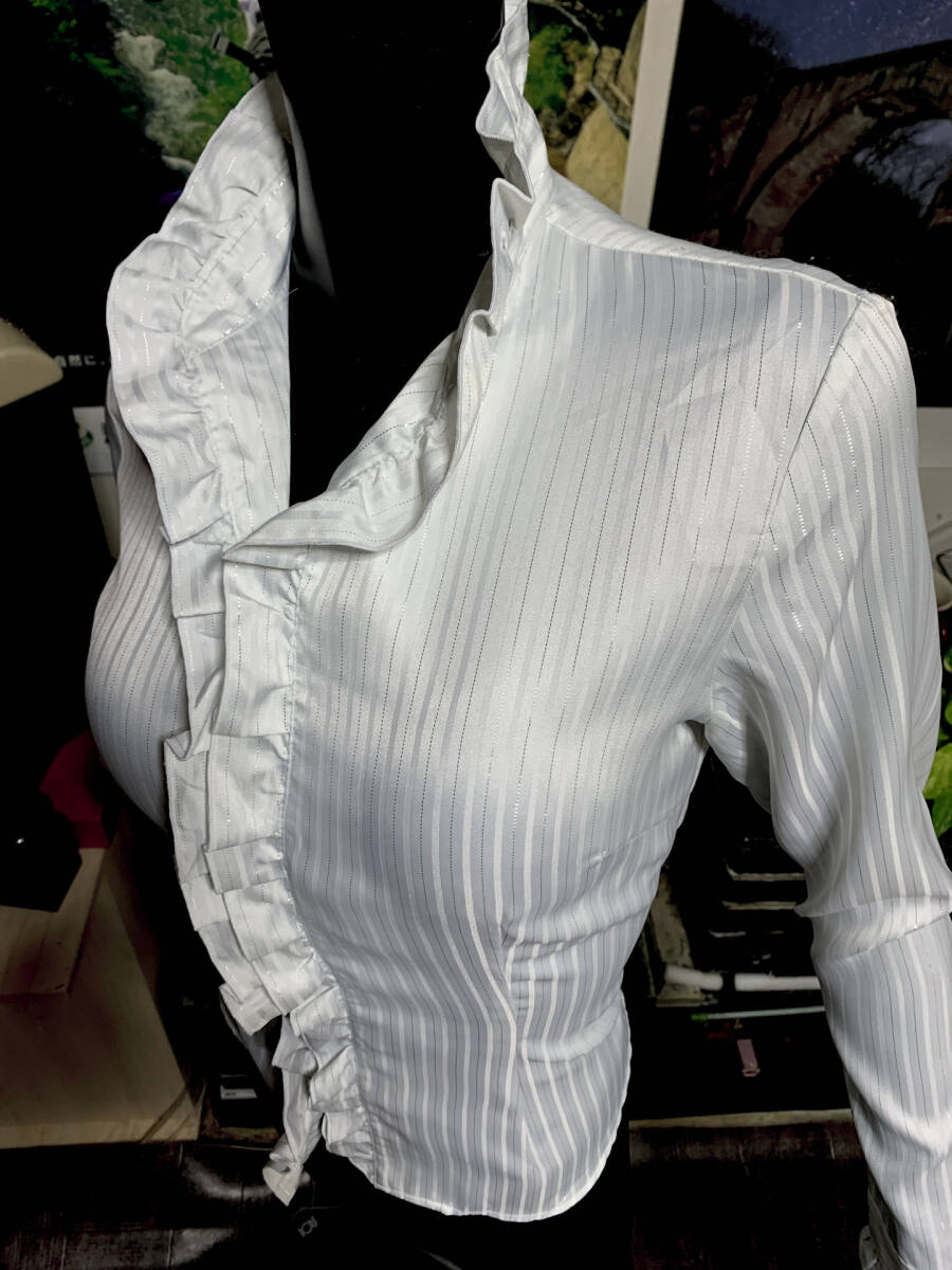 - C / OL セールスレディ オフィス 通勤 御用達 なめらか 光沢 ストレッチ シャドウストライプ ブラウス