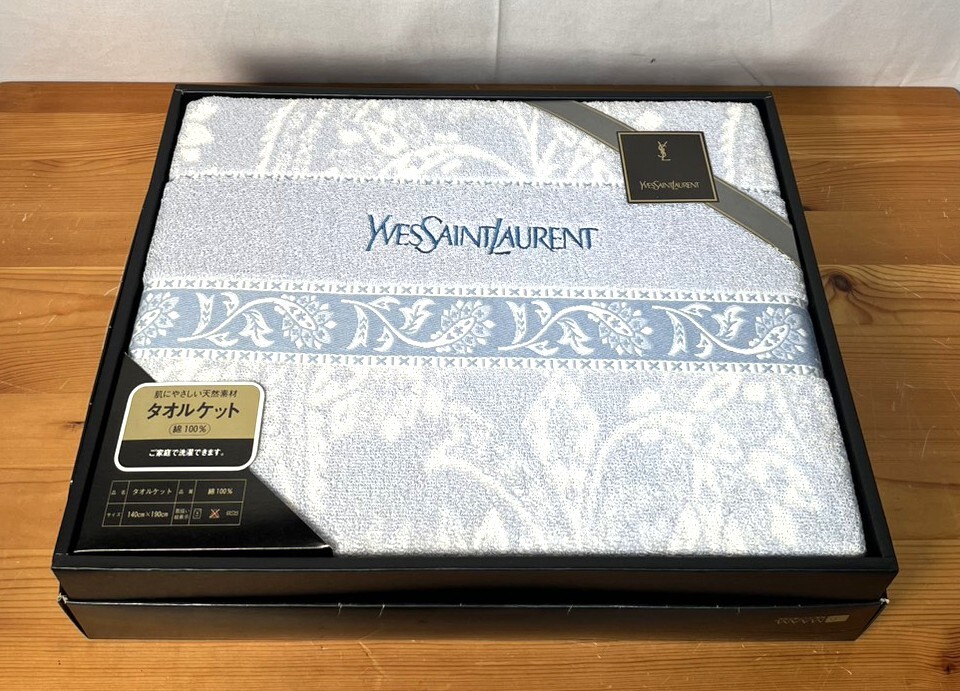 - 【S331】未使用/YSL/イヴサンローラン/YVES SAINT LAURENT/タオルケット/140×190㎝/綿100%/ブルー系/泰道リビング/箱入り/保管品