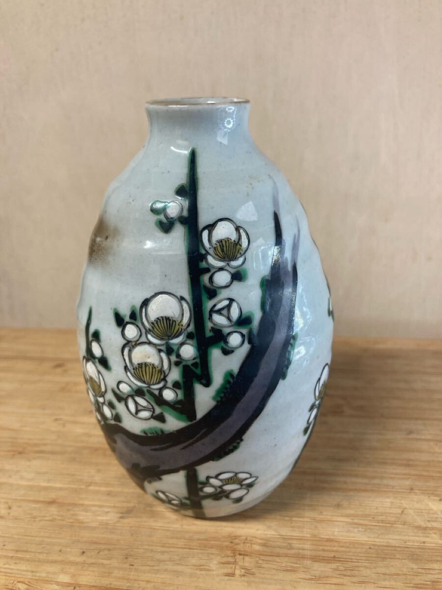 > 古九谷 谷口造 酒器 花入 Vintage Kutani-ware Japanese Sake bottle flower vase 白梅 金彩 gold trim white plum flower