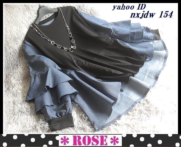 > ◆Rose◇ゆったりワンサイズ・デニム×ニットソー♪ティアードデザインのお袖が可愛いチュニック/インディゴ
