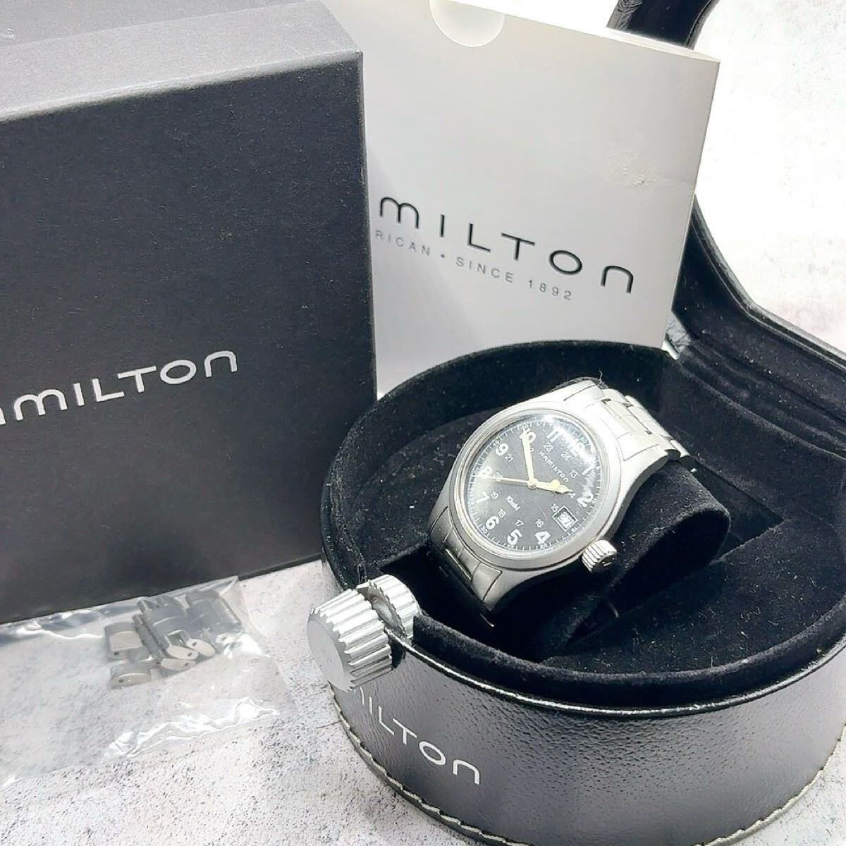 - 【稼働 新品電池】HAMILTON ハミルトン Khaki カーキ 腕時計 デイト シルバー 文字盤:ブラック ラウンド メンズ 箱付き 型番:6361